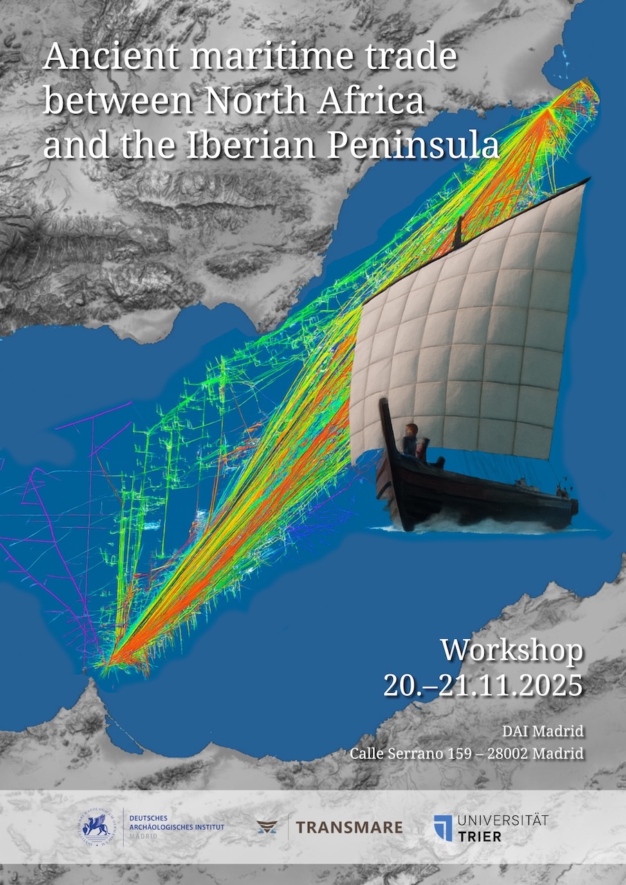 Workshop: „Ancient maritime trade between North Africa and the Iberian Peninsula“ Vom 20.-21. November 2025 findet am Deutschen Archäologischen Institut in Madrid ein von Dr. Max Fiederling (TRANSMARE, Trier) gemeinsam mit PD Dr. Paul Scheding (DAI Madrid) organisierter Workshop zum Thema „Ancient maritime trade between North Africa and the Iberian Peninsula“ statt. Im Mittelpunkt stehen aktuelle Projekte und die Diskussion neuer Perspektiven zur Rekonstruktion des antiken Seehandels. Hier finden Sie das Programm. Weitere Informationen finden Sie hier. + Zu Google Kalender hinzufügen + iCal / Outlook export Datum Nov. 20 - 21 2025 Vorbei! Uhrzeit Ganztägig Veranstaltungsort DAI Madrid Teile diese Veranstaltung